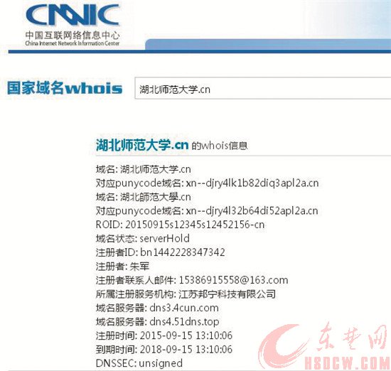 昨日上午,本报记者登陆中国互联网络信息中心查询看到,中文域名“湖北师范大学。CN”和“湖北师范大学。中国”均已注册。注册者朱军。其中,“湖北师范大学。CN”注册时间2015年9月15日13时10分06秒,到期时间2018年9月15日13时10分06秒;“湖北师范大学。中国”注册时间2015年09月15日13时10分02秒,到期时间2018年9月15日13时10分02秒。