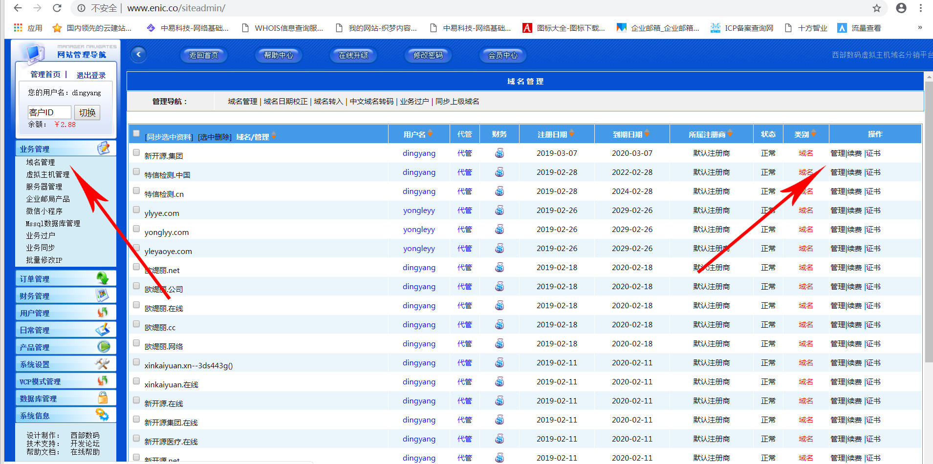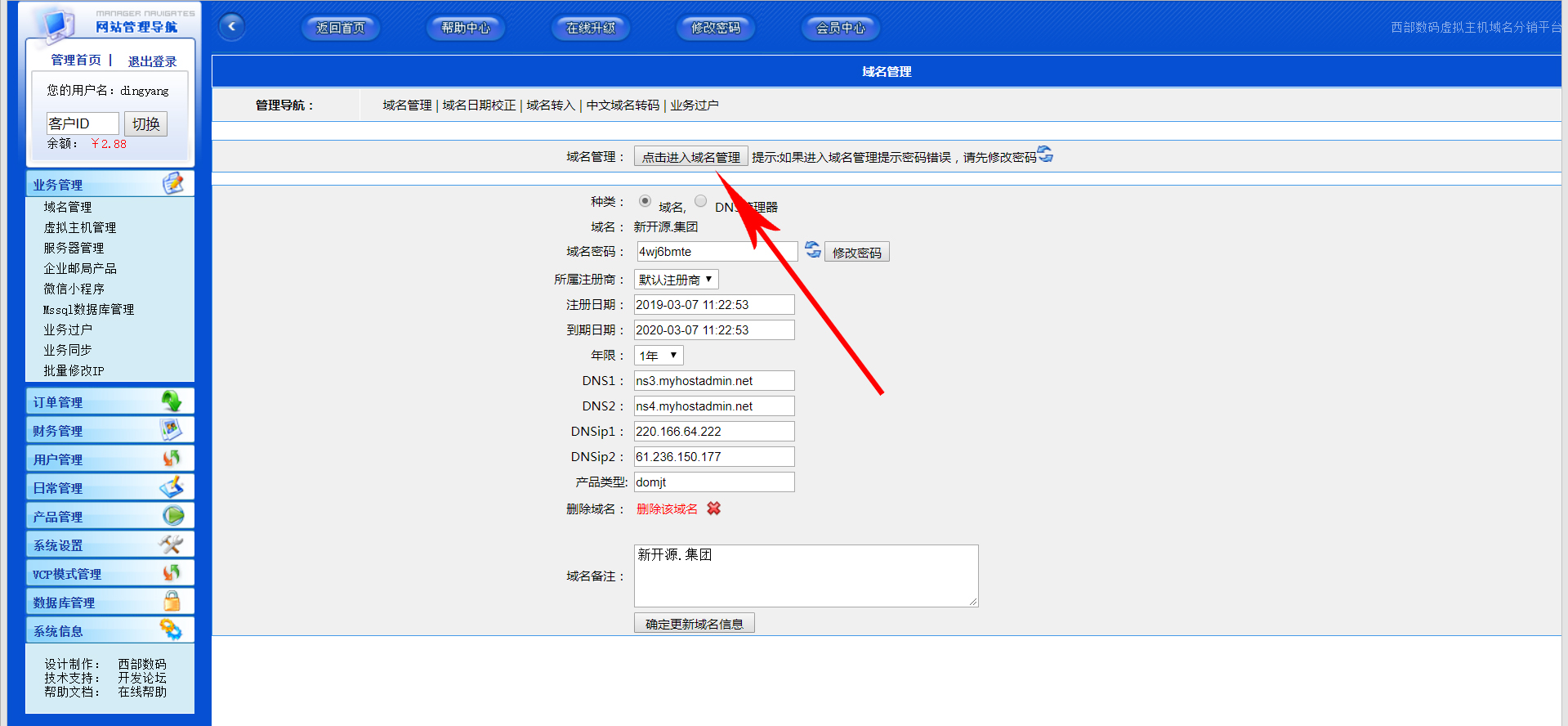2,点开业务管理>域名管理>管理,找到需要解析的域名,然后点击管理