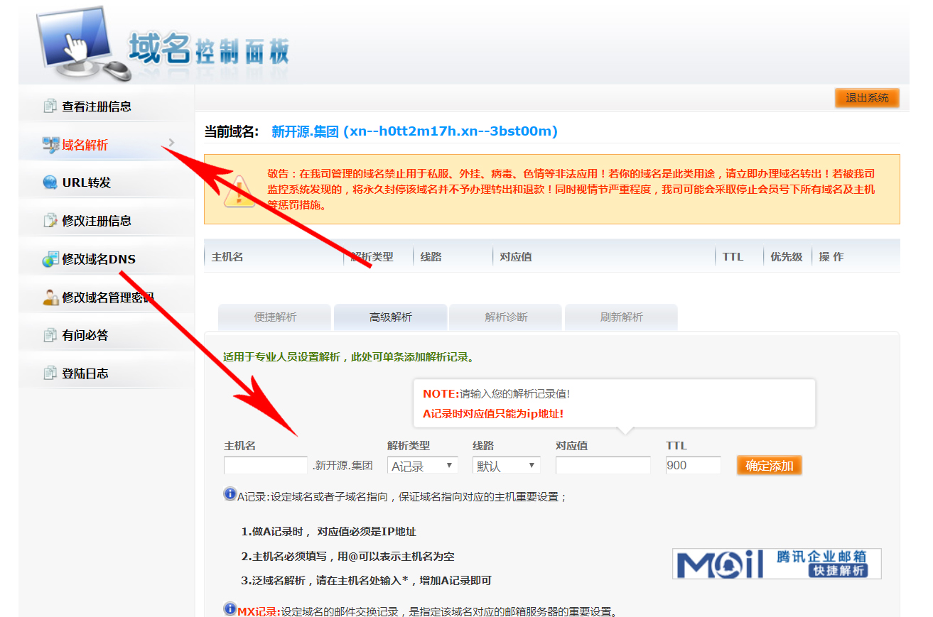 在高级解析中添加解析记录,在主机名出输出,如www或者空主机名@,填写正确对应值即可解析完成。